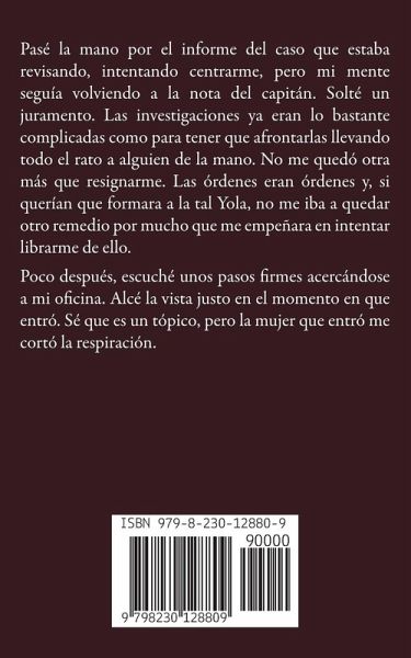 Pasé la mano por el informe del caso que estaba revisando, intentando centrarme, pero mi mente seguía volviendo a la nota del capitán. Solté un juramento. Las investigaciones ya eran lo bastante complicadas como para tener que afrontarlas llevando todo el rato a alguien de la mano. No me quedó otra más que resignarme. Las órdenes eran órdenes y, si querían que formara a la tal Yola, no me iba a quedar otro remedio por mucho que me empeñara en intentar librarme de ello. Poco después, escuché unos pasos firmes acercándose a mi oficina. Alcé la vista justo en el momento en que entró. Sé que es un tópico, pero la mujer que entró me cortó la respiración.