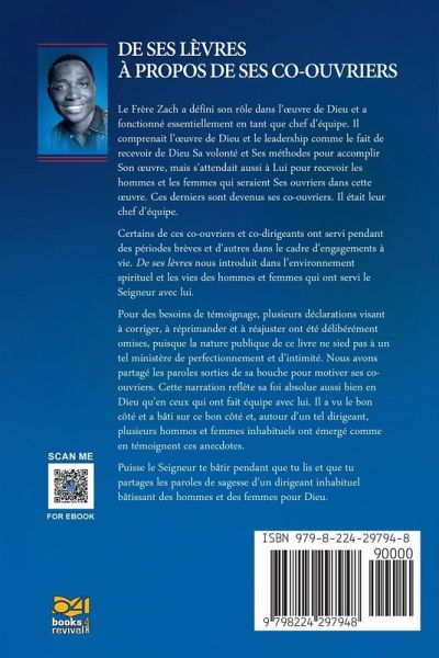 Le Frère Zach a défini son rôle dans l'¿uvre de Dieu et a fonctionné essentiellement en tant que chef d'équipe. Il comprenait l'¿uvre de Dieu et le leadership comme le fait de recevoir de Dieu Sa volonté et Ses méthodes pour accomplir Son ¿uvre, mais s'attendait aussi à Lui pour recevoir les hommes et les femmes qui seraient Ses ouvriers dans cette ¿uvre. Ces derniers sont devenus ses co-ouvriers. Il était leur chef d'équipe. Certains de ces co-ouvriers et co-dirigeants ont servi pendant des périodes brèves et d'autres dans le cadre d'engagements à vie. De ses lèvres nous introduit dans l'environnement spirituel et les vies des hommes et femmes qui ont servi le Seigneur avec lui. Pour des besoins de témoignage, plusieurs déclarations visant à corriger, à réprimander et à réajuster ont été délibérément omises, puisque la nature publique de ce livre ne sied pas à un tel ministère de perfectionnement et d'intimité. Nous avons partagé les paroles sorties de sa bouche pour motiver ses co- ouvriers. Cette narration reflète sa foi absolue aussi bien en Dieu qu'en ceux qui ont fait équipe avec lui. Il a vu le bon côté et a bâti sur ce bon côté et, autour d'un tel dirigeant, plusieurs hommes et femmes inhabituels ont émergé comme en témoignent ces anecdotes. Puisse le Seigneur te bâtir pendant que tu lis et que tu partages les paroles de sagesse d'un dirigeant inhabituel bâtissant des hommes et des femmes pour Dieu.