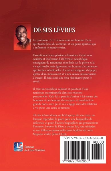Le Professeur Z.T. Fomum était un homme de spiritualité et un génie spirituel qui a influencé le monde entier. Professeur d'Université, scientifique, enseignant de renommée mondiale sur la prière et la vie spirituelle, il était exceptionnel dans plusieurs domaines. En plus de tout cela, il était un homme d'expériences spirituelles inhabituelles. Dirigeant d'une équipe, apôtre d'un mouvement et d'une ¿uvre missionnaire à succès, il a été une voix résonnante pour le réveil. Travailleur acharné, il était pourtant d'une tendresse exceptionnelle dans ses relations personnelles. Cela lui a permit d'attirer à lui-même des hommes et femmes d'envergure et possédant de grands dons, avec qui il s'est engagé dans des relations à vie pour une cause commune. De ses lèvres donne un bref aperçu de son c¿ur, en laissant cependant la place pour une biographie de référence, et pour d'autres biographies qui présenteront l'homme, l'¿uvre de Dieu à travers lui, son ministère et son influence personnelle pour la gloire de notre Seigneur exalté Jésus-Christ.