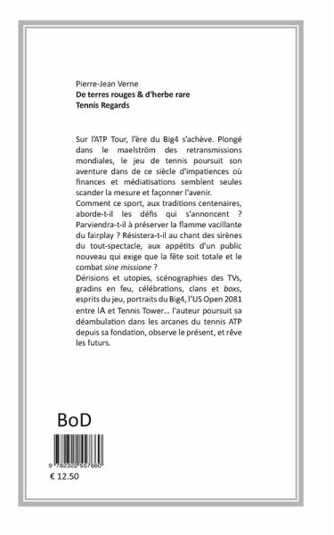 LE TENNIS ATP FACE AU SIECLE XXI Plongé dans le maelström des retransmissions mondiales, le jeu de tennis poursuit son aventure au milieu de ce siècle d'impatiences où médias et sponsors semblent seuls scander la mesure et façonner l'avenir. Comment ce sport, aux traditions centenaires, aborde-t-il les défis qui s'annoncent ? Parviendra-t-il à préserver la flamme vacillante du fairplay ? Résistera-t-il au chant des sirènes du tout-spectacle, aux appétits d'un public qui exige que la fête soit totale et le combat "sine missione" ? TVs, gradins en feu, célébrations, clans, Big4, archéologie et esprits du jeu, US Open 2081, l'auteur poursuit sa déambulation dans les arcanes du tennis version ATP depuis sa fondation, observe le présent et rêve le futur, utopiques ou dérisoires. " Le tennis de l'élite est affaire d'artisan, au rythme lent du poilssage de la matière, à la recherche de la courbe parfaite, de l'ultime reflet du marbre qui mettra au monde la statue du héros."