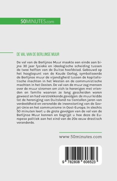 De val van de Berlijnse Muur maakte een einde aan bijna 30 jaar fysieke en ideologische scheiding tussen de twee helften van de Duitse hoofdstad. Gebouwd op het hoogtepunt van de Koude Oorlog, symboliseerde de Berlijnse muur de vijandigheid tussen de kapitalistische machten in het Westen en de communistische machten in het Oosten. De val van de muur zag mensen over de muur stromen om zich te herenigen met vrienden en familie waarvan ze lang gescheiden waren geweest en had verstrekkende gevolgen: de muur leidde tot de hereniging van Duitsland na tientallen jaren van verdeeldheid en versnelde de ineenstorting van de Sovjet-Unie en het communisme in Oost-Europa. In slechts 50 minuten leert u de grote gevolgen van de val van de Berlijnse Muur kennen en begrijpt u hoe deze de Europese politiek aan het eind van de 20e eeuw drastisch veranderde. Dit eenvoudige en informatieve boek geeft een grondige bespreking van de belangrijkste gebeurtenissen die leidden tot de val van de Berlijnse Muur en de belangrijkste betrokkenen, waaronder Egon Krenz en Günter Schabowski. Het bevat ook een waardevolle inleiding tot de politieke, sociale en economische context en een evaluatie van de gevolgen op langere termijn, zodat u over alle essentiële informatie over deze gedenkwaardige gebeurtenis beschikt.
