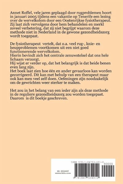 Annet Roffel-de Haas vele jaren geplaagd door rugproblemen en fibromyalgie hoort in januari 2005 tijdens een vakantie een lezing over de wervelkolom op Tenerife door een Oostenrijkse fysiotherapeut. Zij laat zich daar vervolgens door hem behandelen en merkt veel verbetering. Deze fysiotherapeut wijst op de vele problemen, die ontstaan doordat de benen niet even lang zijn. Hij vertelt hoe je dit gevaarloos gecorrigeerd kan worden. Tevens vertelt hij, dat er veel problemen ontstaan na een val of ongeluk, terwijl men dit gebeuren al vergeten is of terwijl men denkt, dat men er goed van af gekomen is. Daar kan soms al wel een jaar tussen zitten. Het zou in het belang van een ieder zijn als deze methode in de reguliere gezondheidszorg zou worden toegepast. Vele ernstige rugproblemen, knie- en heupproblemen kunnen hierbij voorkomen worden, of verbeterd worden. Het boek bevat tevens methoden tot zelfhulp en oefeningen om de spieren te oefenen.