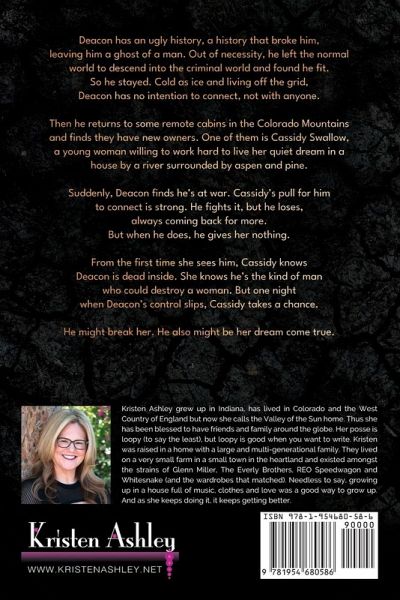 Deacon has an ugly history, a history that broke him, leaving him a ghost of a man. Out of necessity, he left the normal world to descend into the criminal world and found he fit. So he stayed. Cold as ice and living off the grid, Deacon has no intention to connect, not with anyone. Then he returns to some remote cabins in the Colorado Mountains and finds they have new owners. One of them is Cassidy Swallow, a young woman willing to work hard to live her quiet dream in a house by a river surrounded by aspen and pine. Suddenly, Deacon finds he's at war. Cassidy's pull for him to connect is strong. He fights it, but he loses, always coming back for more. But when he does, he gives her nothing. From the first time she sees him, Cassidy knows Deacon is dead inside. She knows he's the kind of man who could destroy a woman. But one night when Deacon's control slips, Cassidy takes a chance. He might break her. He also might be her dream come true.