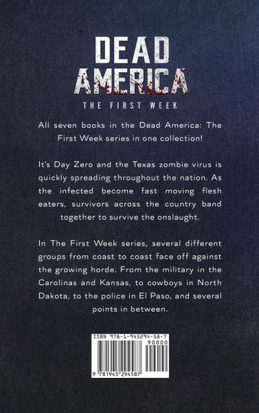 All seven books in the Dead America: The First Week series in one box set! It's Day Zero and the Texas zombie virus is quickly spreading throughout the nation. As the infected become fast moving flesh eaters, survivors across the country band together to battle against the onslaught of the undead. In The First Week series, several different groups from coast to coast face off against the growing horde. From the military in the Carolinas and Kansas, to cowboys in North Dakota, to the police in El Paso, and several points in between. The books in the series are Book 1 - Carolina Front Book 1 Book 2 - Carolina Front Book 2 Book 3 - Carolina Front Book 3 Book 4 - Operation Bismarck Book 5 - The El Paso Invasion Book 6 - Heartland Book 7 - Portland (also includes the epilogue State of the Union)