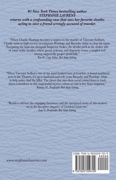 #1 NYT-bestselling author Stephanie Laurens returns with a confounding case that sees her favorite sleuths acting to save a friend wrongly accused of murder. When a detested viscount is found murdered by the banks of the Thames and Charlie Hastings becomes the prime suspect, Barnaby and Penelope Adair join forces with Stokes to discover the real story behind the unexpected killing. Charlie Hastings is astonished to find himself accused of murdering Viscount Sedbury. Admittedly, Charlie had two heated altercations with Sedbury in the hours preceding the man's death, but as Charlie is quick to point out to Stokes - and to Barnaby and Penelope - there are a multitude of others in the ton who will be delighted to learn of Sedbury's demise. As Penelope, Barnaby, and Stokes start assembling a suspect list, Charlie's prediction proves only too accurate. Yet the most puzzling aspect is who on earth managed to kill Sedbury. The man was a hulking brute, large, very strong, and known as a vicious brawler. Who managed to subdue him enough to strangle him? As the number of suspects steadily increases, the investigators are forced to ask if, perhaps, one of their suspects hired a killer capable of taking Sedbury down. With that possibility thrown into the calculations, narrowing their suspect list becomes a futile exercise. Their pursuit of the truth leads them to investigate the many shady avenues of Sedbury's life, much to the consternation of Sedbury's father, the Marquess of Rattenby. Rattenby does not want Sedbury's distasteful proclivities exposed for all the world to see, further harming the other family members who Sedbury has taken great delight in tormenting for most of his life. In the end, the resolution of the crime lies in old-fashioned policing coupled with the fresh twists Barnaby and Penelope bring to Scotland Yard's efforts. And when the truth is finally revealed, it raises questions that strike to the very heart of justice and what, with such a victim and such a murderer, true justice actually means. A historical novel of 62,500 words interweaving mystery and murder with a touch of romance.