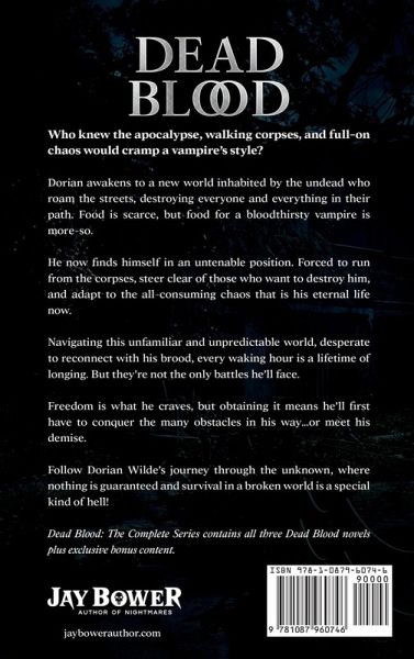 In a world where the dead walk, even vampires must fight to survive. Dorian Wilde awakens to a nightmare-a world consumed by the walking dead, where survival is a savage game and every day is a battle against the unknown. The streets are overrun with flesh-hungry zombies, and humans are no less dangerous, driven to desperation by a crumbling society. But for Dorian, there's an even greater challenge: finding fresh blood in a world where the food chain has completely collapsed. Forced to flee from hordes of the undead and steer clear of those who see him as a threat, Dorian must navigate a broken world that constantly pushes him to the edge of his limits. Desperate to reconnect with his brood, he faces one harrowing obstacle after another, his thirst for blood rivaled only by his longing for freedom. In this brutal apocalypse, the cost of survival is steep, and nothing is guaranteed. Every waking hour is a lifetime of longing and struggle. But for Dorian, an eternity of darkness has prepared him for the fight of his undead life. Dead Blood: The Complete Series delivers all three heart-pounding novels in the best-selling series, plus exclusive bonus content. Fans of The Walking Dead, The Strain, and 30 Days of Night will devour this gripping tale of survival, chaos, and the eternal thirst for blood. Join Dorian Wilde as he battles zombies, humans, and the dark hunger within to carve out his place in an unrecognizable world.