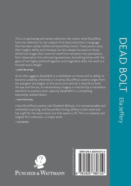 This is a captivating and varied collection. No matter what Ella Jeffery turns her attention to, her subjects find sharp resolution in language that has been subtly crafted and beautifully honed. These poems carry their insights deftly and intensely, her lens always focussed on those alchemical images that move her work from sensation into perception, from observation into shimmering awareness. Everything shines with the gloss of her highly polished linguistic and imaginative skills. Her work is a triumph and a delight. - Judith Beveridge As its title suggests, Dead Bolt is a meditation on home and its ability to become suddenly unhomely or uncanny. Ella Jeffery's poetry ranges from the plangent and elegiac to the comic and satirical. It attends to both the eye and the ear; its extraordinary imagery is matched by a marvellous attention to poetry's sonic capacity. Dead Bolt is a compelling, exquisitely realised debut. - David McCooey I love Ella Jeffery's poetry. Like Elizabeth Bishop's, it is companionable and unshowily surprising, and has perfect timing. Jeffery is clear-eyed and has a gift for the exact word, one that opens a rift. This is a masterly and original first collection - a major work. - Lisa Gorton
