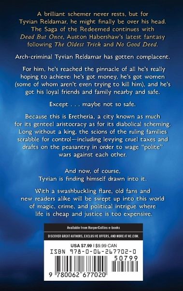 A brilliant schemer never rests, but for Tyvian Reldamar, he might finally be over his head. The Saga of the Redeemed continues with Dead But Once, Auston Habershaw's latest fantasy following The Oldest Trick and No Good Deed. Arch-criminal Tyvian Reldamar has gotten complacent. For him, he's reached the pinnacle of all he's really hoping to achieve: he's got money, he's got women (some of which aren't even trying to kill him), and he's got his loyal friends and family nearby and safe. Except...maybe not so safe. Because this is Eretheria, a city known as much for its genteel aristocracy as for its diabolical scheming. Long without a king, the scions of the ruling families scrabble for control--including levying cruel taxes and drafts on the peasantry in order to wage "polite" wars against each other. And now, of course, Tyvian is finding himself drawn into it. With a swashbuckling flare, old fans and new readers alike will be swept up into this world of magic, crime, and political intrigue where life is cheap and justice too expensive.
