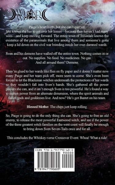 Paige's heart hurts, but she can't quit yet. She knows she has to get over her losses-because they haven't had many wins-and keep moving forward. The entire town of Troutdale knows the existence of the paranormals that live among them and someone's gotta keep a lid down on the civil war breeding inside her own damned wards. Sven and his demons have walled off the entire town. Nothing comes in or out. No supplies. No food. No medicines. No gas. And all around them? Demons. They're glued to her wards like flies on fly paper and it doesn't matter now many Paige and her team pick off, more seem to come. She's even been forced to let the Blackman witches underneath the protections of her wards so they wouldn't fall into Sven's hands. She's gathered all the power players she can, and it isn't enough Sven is too powerful. He's found a way to siphon power from an alternate dimension, where the spirit animals and fallen gods and goddesses live. And now? He's got Bastet on his team. Blessed Mother. The chips just keep rolling. So, Paige is going to do the only thing she can. She's going to free an old enemy, to release the most powerful Eastwood witch, and see if the power of the three greatest witch families on the west coast will finally be enough to bring down Sven Seven-Tails once and for all. This concludes the Whiskey-verse Crossover Event. Whoa! What a ride!
