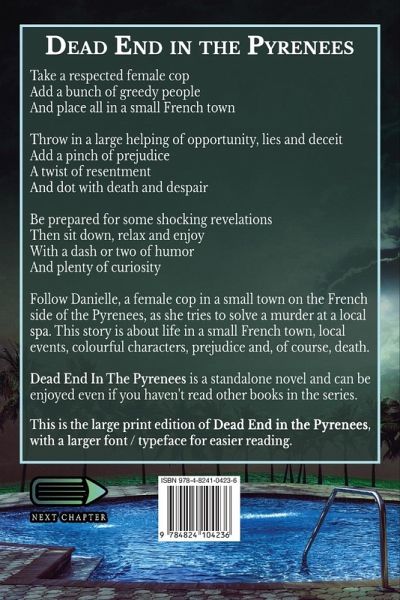 Take a respected female cop Add a bunch of greedy people And place all in a small French town Throw in a large helping of opportunity, lies and deceit Add a pinch of prejudice A twist of resentment And dot with death and despair Be prepared for some shocking revelations Then sit down, relax and enjoy With a dash or two of humor And plenty of curiosity Follow Danielle, a female cop in a small town on the French side of the Pyrenees, as she tries to solve a murder at a local spa. This story is about life in a small French town, local events, colourful characters, prejudice and, of course, death. Dead End In The Pyrenees is a standalone novel and can be enjoyed even if you haven't read other books in the series. This is the large print edition of Dead End in the Pyrenees, with a larger font / typeface for easier reading.