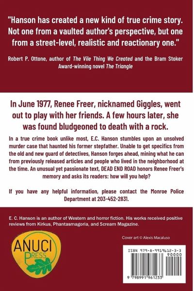 In June 1977, Renee Freer, nicknamed Giggles, went out to play with her friends. A few hours later, she was found bludgeoned to death with a rock. In a true crime book unlike most, E.C. Hanson stumbles upon an unsolved murder case that haunted his former stepfather. Unable to get specifics from the old and new guard of detectives, Hanson forges ahead, mining what he can from previously released articles and people who lived in the neighborhood at the time. An unusual yet passionate text, DEAD END ROAD honors Renee Freer's memory and asks its readers: how will you help?