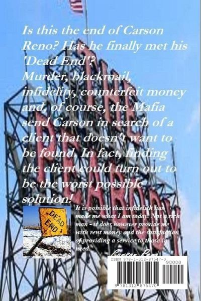 Is this the end of Carson Reno? Has he finally reached the end of the road - his 'Dead End'? Is this Carson's last adventure? While trying to protect a client for Jack Logan, Carson finds himself in the middle of a family feud - a deadly feud with skeletons AND bodies hidden in all the family closets. Murder, blackmail, infidelity, counterfeit money and, of course, the Mafia send Carson in search of a client that doesn't want to be found. In fact, finding the client could turn out to be the worst solution for Carson Reno and his friends. Join Carson as he follows clues and stumbles down a road of mystery. A road with a bad ending - a 'Dead Ending'!