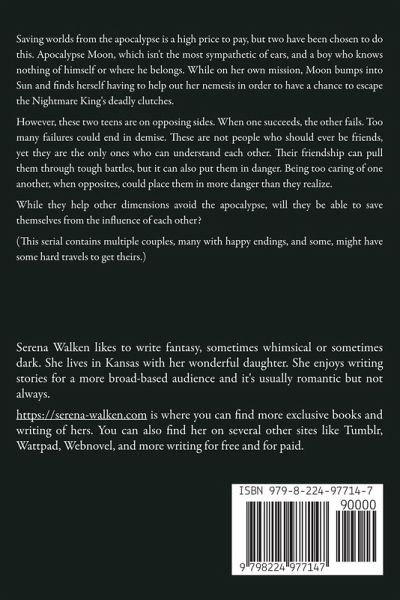 Saving worlds from the apocalypse is a high price to pay, but two have been chosen to do this. Apocalypse Moon, which isn't the most sympathetic of ears, and a boy who knows nothing of himself or where he belongs. While on her own mission, Moon bumps into Sun and finds herself having to help out her nemesis in order to have a chance to escape the Nightmare King's deadly clutches. However, these two teens are on opposing sides. When one succeeds, the other fails. Too many failures could end in demise. These are not people who should ever be friends, yet they are the only ones who can understand each other. Their friendship can pull them through tough battles, but it can also put them in danger. Being too caring of one another, when opposites, could place them in more danger than they realize. While they help other dimensions avoid the apocalypse, will they be able to save themselves from the influence of each other? (This serial contains multiple couples, many with happy endings, and some, might have some hard travels to get theirs.)