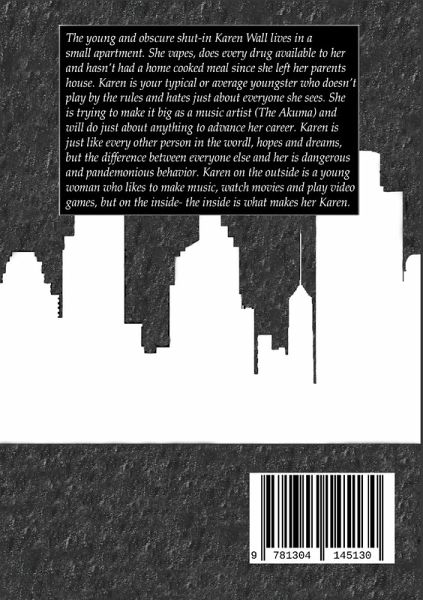 The young and obscure shut-in Karen Wall lives in a small apartment. She vapes, does every drug available to her and hasn't had a home cooked meal since she left her parents house. Karen is your typical or average youngster who doesn't play by the rules and hates just about everyone she sees. She is trying to make it big as a music artist (The Akuma) and will do just about anything to advance her career. Karen is just like every other person in the world, hopes and dreams, but the difference between everyone else and her, is the violence that lives within. Karen on the outside is a young woman who likes to make music, watch movies and play video games, but on the inside- the inside is what makes her Karen.