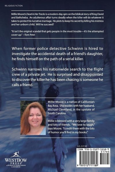 Millie Moore's Dead in Her Tracks is a modern-day spin on the biblical story of King David and Bathsheba. An adulterous affair turns deadly when the killer will do whatever it takes to protect his lucrative marriage. He plots to keep his secret by killing his mistress and her unborn child. Will he succeed? "It isn't the original scandal that gets people in the most trouble-it's the attempted cover-up." --Tom Petri When former police detective Schwinn is hired to investigate the accidental death of a friend's daughter, he finds himself on the path of a serial killer. Schwinn narrows his nationwide search to the flight crew of a private jet. He is surprised and disappointed to discover the killer he has been chasing is someone he calls a friend.