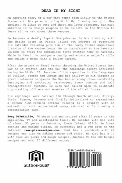 DEAD IN MY SIGHT An exciting story of a boy that comes from Sicily to the United States with his parents during World War I and grows up in New England. He likes to hunt and shoot and loves Firearms. His main ambition is to design weapons so he enlists in the Marines to learn all he can about these weapons. He becomes a deadly Expert Sharpshooter in his training with the Marine Corps at Parris Island but because of peacetime his extended training puts him in the newly formed Amphibious Division of the Marine Corps. He is transferred to the Hawaiian Islands to train the amphibious force whether Army or Marines. While in Hawaii he designs a deadly and accurate sniper's rifle and builds a model with a fellow Marine. After the attack on Pearl Harbor throwing the United States into war he is drafted into the OSS the espionage agency activated during World War II. Because of his expertise in the languages of Italian, French and German and his ability to hit targets at great distances he spends the War behind enemy lines constantly destroying and sabotaging warehouses, truck convoys and rail transportation systems. He also was called upon to eliminate high-ranking officers and enemies of the allied forces. His espionage work carried him through North Africa, Sicily, Italy. France, Germany and finally Switzerland to assassinate a German high-ranking officer fleeing to a country with no extradition with accumulated money extorted while running a concentration camp.