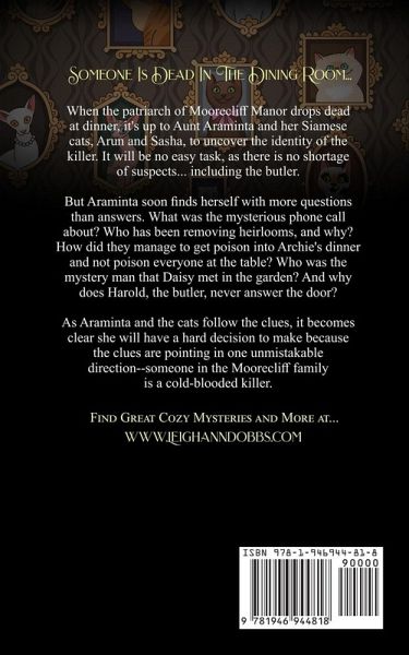 The butler did it.... or did he? A classic whodunit with a clever senior sleuth and mystery solving cats set in a manor house. When the patriarch of Moorecliff Manor drops dead at dinner, it's up to Aunt Araminta and her Siamese cats Arun and Sasha to uncover the identity of the killer. It will be no easy task, as there is no shortage of suspects... including the butler. But Araminta soon finds herself with more questions than answers. What was the mysterious phone call about? Who has been removing heirlooms and why? How did they manage to get poison into Archie's dinner and not poison everyone at the table? Who was the mystery man that Daisy met in the garden? And why does Harold, the butler, never answer the door? As Araminta and the cats follow the clues, it becomes clear that she will have a hard decision to make because the clues are pointing in one unmistakable direction - someone in the Moorecliff family is a cold-blooded killer.