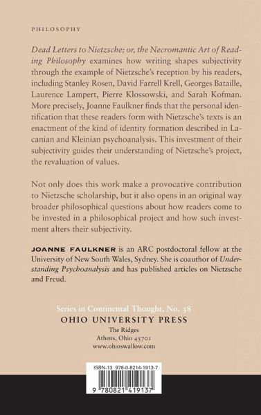 Dead Letters to Nietzsche examines how writing shapes subjectivity through the example of Nietzsche's reception by his readers, including Stanley Rosen, David Farrell Krell, Georges Bataille, Laurence Lampert, Pierre Klossowski, and Sarah Kofman. More precisely, Joanne Faulkner finds that the personal identification that these readers form with Nietzsche's texts is an enactment of the kind of identity-formation described in Lacanian and Kleinian psychoanalysis. This investment of their subjectivity guides their understanding of Nietzsche's project, the revaluation of values. Not only does this work make a provocative contribution to Nietzsche scholarship, but it also opens in an original way broader philosophical questions about how readers come to be invested in a philosophical project and how such investment alters their subjectivity.