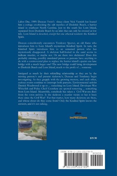 Labor Day 1989: Duncan Twist's sleazy client, Nick Varnish, has loaned him a cottage overlooking the salt marshes of Dusktide Beach, a barrier island in southeast North Carolina. Just to the south lies Lorn Island, which is deserted, except for one ethereal resident: the Kindred Spirit. Duncan accidentally encounters a former lover, Tendency Specter, who introduces him to the Kindred Spirit. In turn, the Kindred Spirit introduces him to an unnamed person who has mysteriously disappeared. Intrigued as much by their rekindling relationship as they are by the missing person, Duncan and Tendency begin investigating. As they grapple with both the growing mystery and each other, curious events continue to interrupt both interests. A skeleton half-buried in the sand seems to indicate murder... or maybe not. Or are there two skeletons? Is the skeleton a murder victim or has it been there since the Civil War? Only the Kindred Spirit knows the answers, and it's not talking.