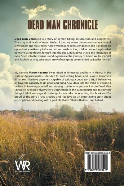 Dead Man Chronicle is a story of demon killing, resurrection and atonement. The story and death of Aaron Weller. A journey across dimensions set in a time of lawlessness and fear. Follow Aaron Weller as he seeks vengeance and is granted an opportunity unlike any he's ever had and see how long it takes before he gets what he wants as he throws himself into the deep, dark abyss that is the ignorance of men. Stare into the darkness and experience the journey of Aaron Weller, Gabriel and Raphael as they take on an army of evil spirits commanded by Lucifer himself.