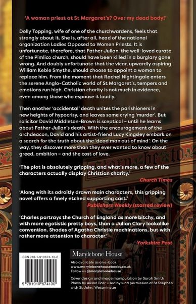 "A woman priest at St Margaret's? Over my dead body!" Dolly Topping, head of the national organisation 'Ladies Opposed to Women Priests' and wife of one of the churchwardens, feels that strongly about it. It is unfortunate, therefore, that Father Julian, the well-loved curate of the Pimlico church, should have been killed in a burglary gone wrong. And doubly unfortunate that the Vicar, upwardly-aspiring William Keble Smythe, should choose to appoint a woman to replace him. From the moment that Rachel Nightingale enters the serene Anglo-Catholic world of St Margaret's, tempers and emotions run high; Christian charity is not much in evidence, even among those who espouse it loudly. Then another accidental death unites the parishioners in new heights of hypocrisy, and leaves some crying murder. But David Middleton-Brown is sceptical until he learns about Father Julian's death. With the encouragement of the Archdeacon, David and Lucy Kingsley embark on a search for the truth about the 'dead man out of mind', and discover more than they ever wanted to know about greed, hypocrisy, ambition and the cost of love.