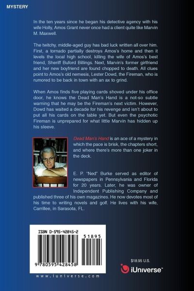 In the ten years since he began his detective agency with his wife Holly, Amos Grant never once had a client quite like Marvin M. Maxwell. The twitchy, middle-aged guy has bad luck written all over him. First, a tornado partially destroys Amos's home and then it levels the local high school, killing the wife of Amos's best friend, Sheriff Buford Billings. Next, Marvin's former girlfriend and her new boyfriend are found chopped to death. All clues point to Amos's old nemesis, Lester Dowd, the Fireman, who is rumored to be back in town with an ax to grind. When Amos finds five playing cards shoved under his office door, he knows the Dead Man's Hand is a not-so subtle warning that he may be the Fireman's next victim. However, Dowd has waited a decade for his revenge and isn't about to put all his cards on the table yet. But even the psychotic Fireman is unprepared for what little Marvin has hidden up his sleeve. Dead Man's Hand is an ace of a mystery in which the pace is brisk, the chapters short, and where there's more than one joker in the deck.
