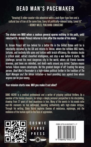 The stakes are WAR when a zealous general spares nothing in his path, until reluctant Dr. Arman Pirouzi returns to Iran after the murder of his niece. "Filled with intrigue and shocking twists, it's a must-read for anyone who loves political thrillers with real-world relevance." -Jennifer Eaton, USA TODAY Bestselling Author Dr. Arman Pirouzi left Iran behind for a better life in the United States until he is reluctantly recruited by the CIA and returns to Tehran, where the ruthless IRGC hunts, tortures, and routinely kills spies and traitors with brutal efficiency. His mission: locate a critical asset, extract classified intelligence, and stop a war before it starts. His challenge: survive the most dangerous city in the world, where old friends become enemies, past loves are rekindled, and death waits around any corner. Capture means torture. Failure means catastrophe. But the greatest danger of all? Trusting the wrong person. Dead Man's Pacemaker is a high-stakes political thriller in the tradition of The Night Manager and The Tehran Initiative-a heart-pounding race against time where anyone can be your enemy. Your mission starts now. Will you make it out alive?