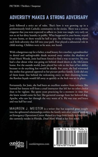 Josie followed a strict set of rules. That's how it was growing up in a predominately Irish Catholic community in the sixties. There was a certain etiquette that you were expected to adhere to. Josie was taught very early on not to air her dirty laundry in public. What happened in your home, stayed in your home, or there would be hell to pay. No whining or crying about each little adversity that fell into your path. Fear played a substantial role in child rearing. Children were to be seen, not heard. With a dangerous cop for a father, a mad beauty for a mother, a grandmother in denial and unforgiveable deeds secreted away within the shadows of Dead Man's Woods, Josie had been forced to find a way to survive. No one had a clue about what was going on behind closed doors at the McGinnis home. For the outside world, Josie played her role to the best of her ability because to do anything less would be deadly. For years, she had witnessed the smiles that granted approval to her picture-perfect family. Little did any of them know that behind the welcoming entry to their charming home, the flawless façade would fall away as quickly as the lock was set in place. Fortunately, for Josie, she had been an excellent student from infancy. She learned her lessons well from a cruel instructor that left her no other choice than to be vigilant. She spent years practicing for a moment in time that she knew would come for her. She garnered courage from her beloved dog, Apache, who saw her through the very worst of it. He was true and brave and was half her soul.