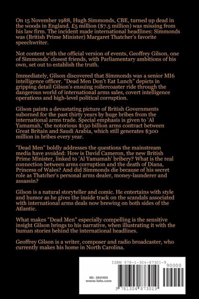 "Dead Men Don't Eat Lunch" paints a devastating picture of how British Governments have been corrupted for 30 years by huge bribes from the international arms trade, and how that corruption may even now be tainting the Liberal-Conservative Coalition Government of David Cameron and Nick Clegg. Special emphasis is given in "Dead Men" to the role of 'Al Yamamah,' the notorious $150 billion arms contract between Great Britain and Saudi Arabia, which still generates $300 million in kickbacks every year. The author sets out, in gripping detail, his own discovery that the mysterious death of his close colleague, and former rising British political star, Hugh Simmonds CBE, was the direct consequence of his deadly role as British Prime Minister Margaret Thatcher's personal arms dealer, money-launderer and assassin.