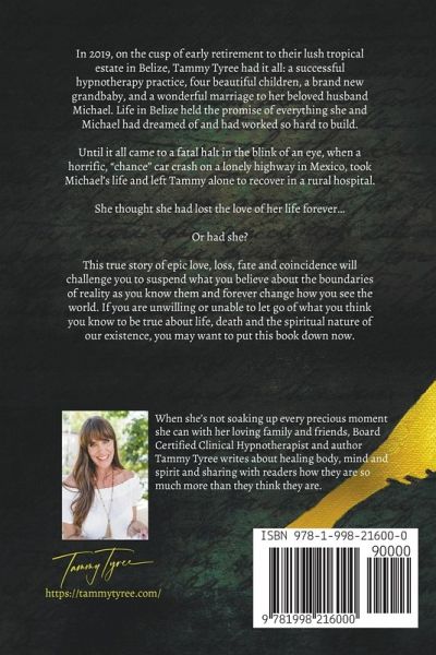 Sometimes, an ending is just the beginning... In 2019, on the cusp of early retirement to their lush tropical estate in Belize, Tammy Tyree had it all: a successful hypnotherapy practice, four beautiful children, a brand new grandbaby, and a wonderful marriage to her beloved husband Michael. Life in Belize held the promise of everything she and Michael had dreamed of and had worked so hard to build. Until it all came to a fatal halt in the blink of an eye, when a horrific, "chance" car crash on a lonely highway in Mexico, took Michael's life and left Tammy alone to recover in a rural hospital. She thought she had lost the love of her life forever… Or had she? This true story of epic love, loss, fate and coincidence will challenge you to suspend what you believe about the boundaries of reality as you know them and forever change how you see the world. If you are unwilling or unable to let go of what you think you know to be true about life, death and the spiritual nature of our existence, you may want to put this book down now. This is a true story. It is a memoir but also a love story for women, about spirituality, spiritual healing, spiritual awakening, near-death experiences and grief for loss of a husband. This book was truly a team effort between myself and my late husband, Michael, after his death. Through the sharing of our beautiful love story, tragic ending and subsequent communication with Michael on the 'other side', I could heal, inspire and comfort others who have loved and lost by sharing Michael's message of what life is like after death. It is also a story of coincidence, or that there are none. The weaving together of the non-coincidental things that fell into place days, months and years before Michael's death is a certain testament to the fact. And, lastly, it is a story of my spiritual growth and discovery. Sharing the part of me that learned who I truly am, the nature of our existence, and that the inner belief I had held since a child was the truth of our existence, as shown or proven through the death of my husband. It is a story that had to be told. A true, tragic and loving tale almost too incredible to believe. Spanning between 12 years of our lives together, living in both Canada and Belize, we share our epic adventures, struggles, love and loss. What Readers are Saying: "…A captivating, satisfying, page-turner of a read. Pure, raw, often painfully palpable and always bittersweet emotion and ENERGY permeates every single section of this book…" "I could not put this book down! It mesmerized me from page one..." "...An incredible story, a page turning read!" "Not only is this a page-turner, it's a bestselling masterpiece!"