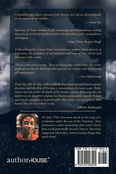 Compelling play about a dynasty of the human race, are we all psychopaths or just figures of our intellect. Selina Sra Opening set I was hooked deeply interesting and extraordinary moving depiction of survival of mankind with twists of madness, pain, manipulation and despair . Asian Times Rupert Singh A disturbing play if deep broad mediation on violence from atrocity to forgiveness, the paradoxes of representation and tears of war, sincere and otherwise with a twist. This is a rare achievement . There are many play writes where the writer speaks of war and the dark evil, and none that are written with such literacy self -consciousness. Leo Mackintosh Dead Men Tell No Tales, well outside the boundaries of established academic discourse, and the firm of the play is extraordinary in many ways. Richie Smartt not only probes the depths of the human capacity of atrocity, but also explores in an altogether original and hearty unrepeatable way the human capacity for sympathy or empathy with those whose acts have placed them beyond the pale of civilised society. Adlibris Bokhandel --------------------------------- On July 1703, four men stood on the cusp of a revolution under the sun of the Americas. They planned to claim something that wasn't theirs that could potentially become history. But what happened when they started seeing things that aren't there?