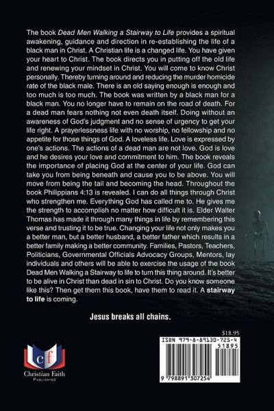 The book Dead Men Walking a Stairway to Life provides a spiritual awakening, guidance, and direction in reestablishing the life of a Black man in Christ, thereby turning around and reducing the murder homicide rate of the Black male. There is an old saying, "Enough is enough, and too much is too much." The book was written by a Black man for a Black man. You no longer have to remain on the road of death. For a dead man fears nothing, not even death itself. Doing without an awareness of God's judgment and no sense of urgency to get your life right. A prayerlessness life with no worship, no fellowship, and no appetite for those things of God. A loveless life. Love is expressed by one's actions. The actions of a dead man is not love. God is love, and he desires your love and commitment to him. The book reveals the importance of placing God at the center of your life. God can take you from being beneath and cause you to be above. You will move from being the tail and becoming the head. Throughout the book, Philippians 4:13 reveals, "I can do all things through Christ who strengthens me." Everything God has called me to, he gives me the strength to accomplish, no matter how difficult it is. Author Elder Walter Thomas has made it through many things in life by remembering this verse and trusting it to be true. Changing your life not only makes you a better man but also a better husband, a better father, which results in a better family, making a better community. Families, pastors, teachers, politicians, governmental officials advocacy groups, mentors, lay individuals, and others will be able to exercise the usage of Dead Men Walking a Stairway to Life to turn this thing around.