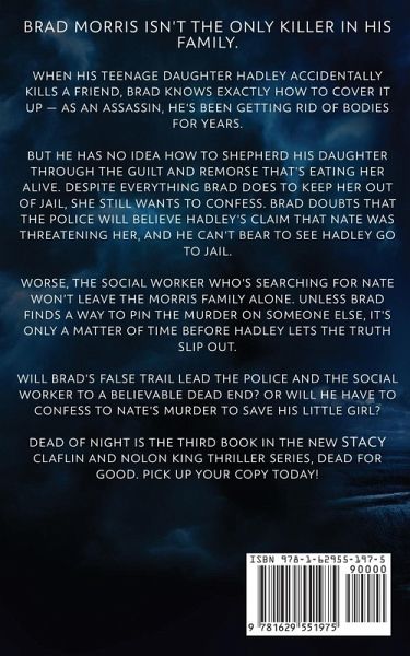 Brad Morris isn't the only killer in his family. When his teenage daughter Hadley accidentally kills her friend, Nate, Brad knows exactly how to cover it up - as an assassin, he's been getting rid of bodies for years. But he has no idea how to shepherd his daughter through the guilt and remorse that's eating her alive. Despite everything Brad does to keep her out of jail, she still wants to confess. Brad doubts that the police will believe Hadley's claim that Nate was threatening her, and he can't bear to see Hadley go to jail. Worse, the social worker who's searching for Nate won't leave the Morris family alone. Unless Brad finds a way to pin the murder on someone else, it's only a matter of time before Hadley lets the truth slip out. Will Brad's false trail lead the police and the social worker to a believable dead end? Or will he have to confess to Nate's murder to save his little girl? Dead of Night is the third book in the new Stacy Claflin and Nolon King thriller series, Dead For Good. Pick up your copy today!