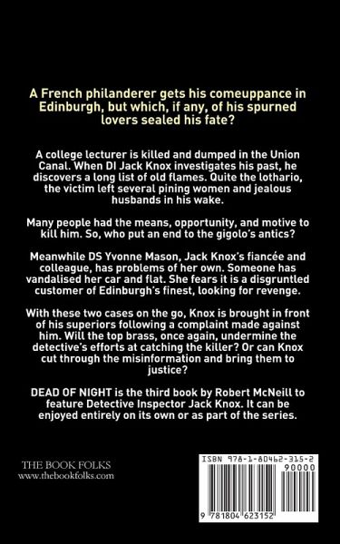 A French philanderer gets his comeuppance in Edinburgh, but which, if any, of his spurned lovers sealed his fate? A college lecturer is killed and dumped in the Union Canal. When DI Jack Knox investigates his past, he discovers a long list of old flames. Quite the lothario, the victim left several pining women and jealous husbands in his wake. There is no shortage of suspects. Many people had the means, opportunity, and motive to kill him. So, who put an end to the gigolo's antics? Meanwhile DS Yvonne Mason, Jack Knox's fiancée and colleague, has problems of her own. Someone has vandalised her car and flat. She fears it is a disgruntled customer of Edinburgh's finest, looking for revenge. With these two cases on the go, Knox is brought in front of his superiors following a complaint made against him. Will the top brass, once again, undermine the detective's efforts at catching the killer? Or can Knox cut through the misinformation and bring them to justice? DEAD OF NIGHT is the third book by Robert McNeill to feature Detective Inspector Jack Knox. It can be enjoyed entirely on its own or as part of the series. The full list of books is: 1. THE INNOCENT AND THE DEAD (includes the prequel LABYRINTH) 2. MURDER AT FLOOD TIDE 3. DEAD OF NIGHT 4. NOUGHTS AND CROSSES 5. A VIEW TO MURDER 6. CONFESSION TO MURDER 7. DON'T CRY, DARLING