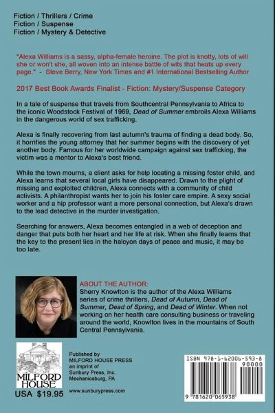 In a tale of suspense that travels from Southcentral Pennsylvania to Africa to the iconic Woodstock Festival of 1969, Dead of Summer embroils Alexa Williams in the dangerous world of sex trafficking. With help from friends, family, and her yoga practice, Alexa Williams is finally starting to recover from last autumn's trauma of finding a dead body and the violence that ensued. The young attorney can't believe that her summer has begun with the discovery of another body. This time, the dead woman was famous for her worldwide campaign against sex trafficking. The murder hits close to home: the late activist was a friend and mentor to Alexa's best friend, Melissa. While the town mourns, Alexa stumbles into a burglary at Melissa's home, barely escaping serious harm. A client asks for help in convincing the police that her foster child is not a runaway, and Alexa learns that other local girls have gone missing. Drawn into the fight to save lost and exploited children, Alexa discovers a community of child activists. A local philanthropist wants Alexa to join his foster care empire. A sexy social worker and a hip college professor want a more personal connection with Alexa, but she is also drawn to the police detective leading the murder investigation. Searching for answers, Alexa becomes entangled in a web of deception and danger that puts both her heart and her life at risk. By the time she discovers that the key to the present lies in the halcyon days of peace and music, it may be too late.