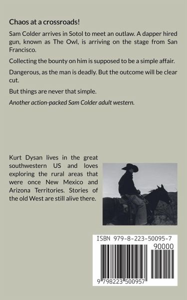 Chaos at a crossroads! Sam Colder arrives in the little stage stop town of Sotol, in Arizona Territory to meet an outlaw - a dapper hired gun, known as The Owl, is arriving on the stage from San Francisco. Collecting the bounty on him is supposed to be a simple affair. Dangerous, as the man is deadly. But the outcome will be clear cut. The unhappy wife of the local sheriff who also runs the boarding house sees Sam as a possible solution to the problems in her life. He is someone who can get her out of a jam, and possibly add some excitement to her dull life. When the owner of a cathouse in neighboring Cochise arrives, she brings another set of issues for Sam that are compounded when a rider comes in that Sam at first takes to be the ruthless outlaw Wade Freeman. It isn't Wade, but the man is a dead ringer for outlaw - a man shot a while back and thought, hoped, was dead. Wade isn't dead. He's alive and living in Cochise. Now Sam faces confusion and enemies on several fronts. If things go well, he'll reap the reward of collecting two bounties. But he has a lot to deal with before that can happen. And he has to start by taking down The Owl. Another action-packed Sam Colder adult western.