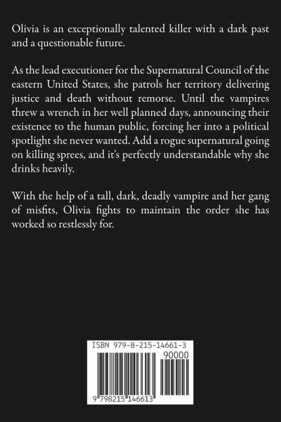 Olivia is an exceptionally talented killer with a dark past and a questionable future. As the lead executioner for the Supernatural Council of the eastern United States, she patrols her territory delivering justice and death without remorse. Until the vampires threw a wrench in her well planned days, announcing their existence to the human public, forcing her into a political spotlight she never wanted. Add a rogue supernatural going on killing sprees, and it's perfectly understandable why she drinks heavily. With the help of a tall, dark, deadly vampire and her gang of misfits, Olivia fights to maintain the order she has worked so restlessly for.