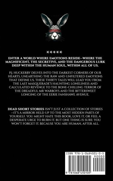 Enter a world where emotions live-where the magnificent, the secretive, and the dangerous lurk deep within the human soul, within all of us. P.J. Huckerby delves into the darkest corners of our hearts, unearthing the raw and unfiltered emotions that define us. These thirty tales will lead you from The Last Masquerade's haunting loneliness and calculated revenge to the bone-chilling terror of The Dreadful Mr Warboys and the bittersweet longing of the eerie Fanshawe Avenue.DEAD SHORT STORIES isn't just a collection of stories-it's a mirror held up to the most hidden parts of yourself. You might hate this book, love it, or feel a desperate urge to burn it. But one thing is sure: you won't forget it. Because you are human, after all.