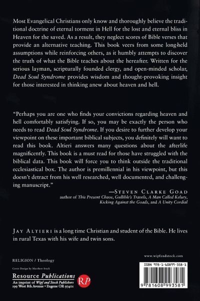 Most Evangelical Christians only know and thoroughly believe the traditional doctrine of eternal torment in Hell for the lost and eternal bliss in Heaven for the saved. As a result, they neglect scores of Bible verses with that provide an alternative teaching. This book veers from some long-held assumptions while reinforcing others, as it humbly attempts to discover the truth of what the Bible teaches about the hereafter. Written for the serious layman, scripturally founded clergy, and open-minded scholar, Dead Soul Syndrome provides wisdom and thought-provoking insight for those interested in thinking anew about heaven and hell.