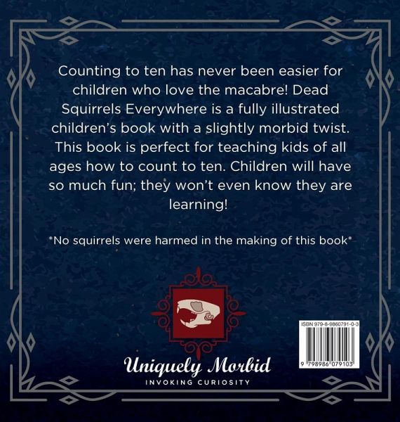Counting to ten has never been easier for children who love the macabre! Dead Squirrels Everywhere is a fully illustrated children's book with a slightly morbid twist. This book is perfect for teaching kids of all ages how to count to ten. Children will have so much fun; they won't even know they are learning! *No squirrels were harmed in the making of this book*