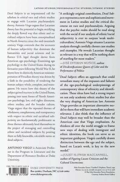 Dead Subjects is an impassioned call for scholars in critical race and ethnic studies to engage with Lacanian psychoanalytic theory. Antonio Viego argues that Lacanian theory has the potential to begin rectifying the deeply flawed way that ethnic and racialized subjects have been conceptualized in North America since the mid-twentieth century. Viego contends that the accounts of human subjectivity that dominate the humanities and social sciences and influence U.S. legal thought derive from American ego psychology. Examining ego psychology in the United States during its formative years following World War II, Viego shows how its distinctly American misinterpretation of Freudian theory was driven by a faith in the possibility of rendering the human subject whole, complete, and transparent. Viego traces how this theory of the subject gained traction in the United States, passing into most forms of North American psychology, law, civil rights discourse, ethnic studies, and the broader culture. Viego argues that the repeated themes of wholeness, completeness, and transparency with respect to ethnic and racialized subjectivity are fundamentally problematic as these themes ultimately lend themselves to the project of managing and controlling ethnic and racialized subjects by positing them as fully knowable, calculable sums: as dead subjects. He asserts that the refusal of critical race and ethnic studies scholars to read ethnic and racialized subjects in a Lacanian framework-as divided subjects, split in language-contributes to a racist discourse. Focusing on theoretical, historical, and literary work in Latino studies, he mines the implicit connection between Latino studies' theory of the "border subject" and Lacan's theory of the "barred subject" in language to argue that Latino studies is poised to craft a critical multiculturalist, anti-racist Lacanian account of subjectivity while adding historical texture and specificity to Lacanian theory.