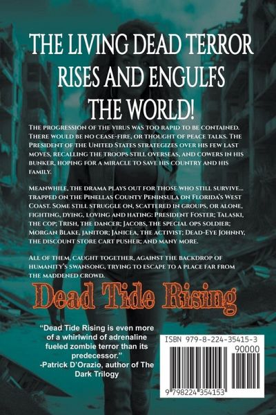THE LIVING DEAD TERROR RISES AND ENGULFS THE WORLD! THE PROGRESSION OF THE VIRUS WAS TOO RAPID TO BE CONTAINED. There would be no cease-fire, or thought of peace talks. The President of the United States strategizes over his few last moves, recalling the troops still overseas, and cowers in his bunker, hoping for a miracle to save his country and his family. Meanwhile, the drama plays out for those who still survive... trapped on the Pinellas County on Florida's West Coast. Some still struggle on scattered in groups, or alone, fighting, dying, loving, and hating: President Foster; Talaski, the cop; Trish, the dancer; Jacobs, the special ops soldier; Morgan Blake, janitor; Janicea, the activist; Dead-Eye Johnny, the discount store cart pusher; and many more.