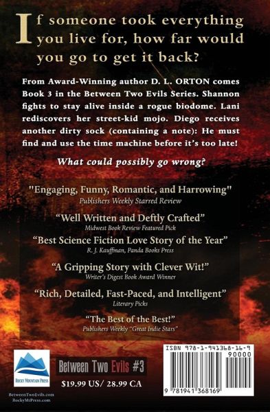 From award-winning author D. L. ORTON comes book three in the Between Two Evils series... Shannon fights to stay alive inside a rogue biodome and discovers something totally unexpected... Peter. Lani is forced into the role of the reluctant heroine but rediscovers her street-kid mojo and sets out to find everything she's lost. Diego receives another dirty sock (and a note) from the fireball express: The window between universes is closing. If Diego has any hope of getting back to Iz, he must get to the Magic Kingdom and fix the time machine before it's too late. What could possibly go wrong?