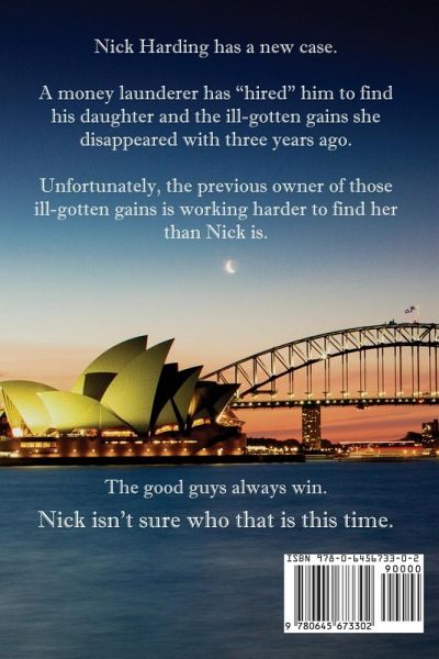 Nick Harding has a new case. A man who used to be one of his targets when he sat in a seat in the Australian Federal Police tracking money launderers has "hired" him to find his daughter. Not "hired" so much as "kidnapped". He'll be free to leave once the daughter-father reunion happens. The daughter has no interest in meeting her father. She's only in town to disburse three-year-old ill-gotten gains. Ten million of them. And if the father was honest, it's those ill-gotten gains he really wants to meet up with. Unfortunately for the daughter, the father, and Nick and his colleagues, the previous owner of those ill-gotten gains is working harder to find her than Nick is. The good guy always wins. Nick isn't sure who that is this time.
