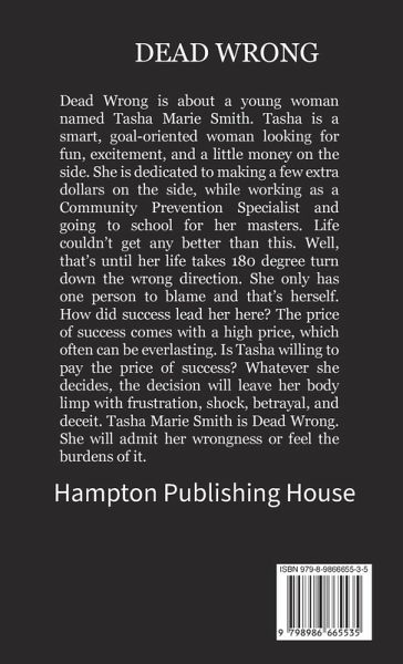 Dead Wrong is about a young woman name Tasha Marie Smith. Tasha is a smart, goal-oriented woman looking for fun, excitement, and a little money on the side. She is dedicated to making a few extra dollars on the side, while working as a Community Prevention Specialist and going to school for her Master's. Life couldn't get ant better than this. Well, that's until her life takes 180 degree turn down the wrong direction. She only has one person to blame and that's herself. How did success lead her here? The price of success comes with a high price, which often can be everlasting. Is Tasha willing to pay the price of success? Whatever she decides, the decision will leave her body limp with frustration, shock, betrayal, and deceit. Tasha Marie Smith is dead Wrong. She will admit her wrongness or feel the burdens of it.