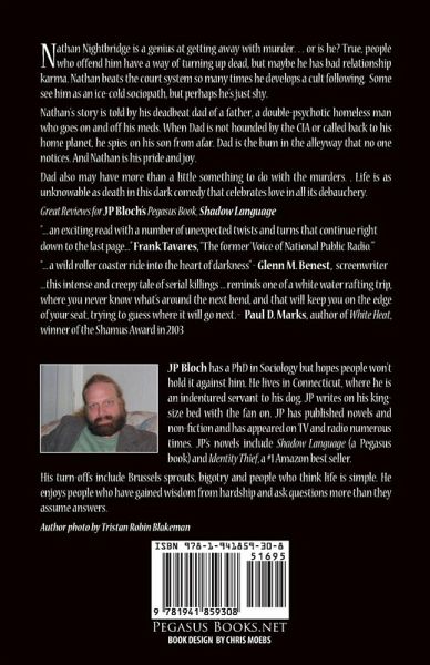Nathan Nightbridge is a genius at getting away with murder. . . or is he? True, people who offend him have a way of turning up dead, but maybe he has bad relationship karma. Nathan beats the court system so many times he develops a cult following. Some see him as an ice-cold sociopath, but perhaps he's just shy. Nathan's story is told by his deadbeat dad of a father, a double-psychotic homeless man who goes on and off his meds. When Dad is not hounded by the CIA or called back to his home planet, he spies on his son from afar. Dad is the bum in the alleyway that no one notices. He grins from the edges of our bad dreams. And Nathan is his pride and joy. Dad also may have more than a little something to do with the murders. When he steps forward to meet Nathan, everything gets resolved. . . but not in the way one might expect. Life is as unknowable as death in this dark comedy that celebrates love in all its debauchery.