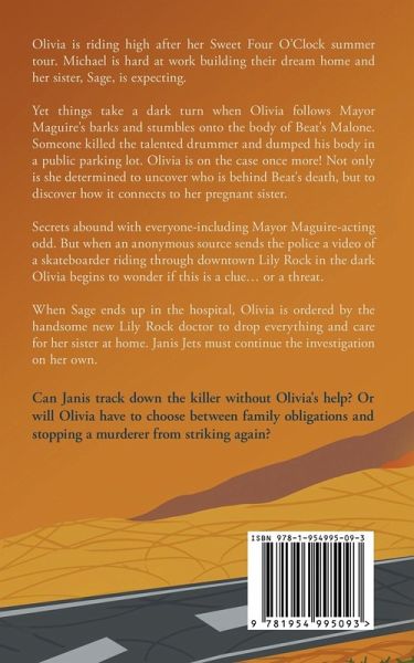 Olivia is riding high after her Sweet Four O'Clock summer tour. Michael is hard at work building their dream home and her sister, Sage, is expecting. Yet things take a dark turn when Olivia follows Mayor Maguire's barks and stumbles onto the body of Beat's Malone. Someone killed the talented drummer and dumped his body in a public parking lot. Olivia is on the case once more! Not only is she determined to uncover who is behind Beat's death, but to discover how it connects to her pregnant sister. Secrets abound with everyone-including Mayor Maguire-acting odd. But when an anonymous source sends the police a video of a skateboarder riding through downtown Lily Rock in the dark Olivia begins to wonder if this is a clue... or a threat. When Sage ends up in the hospital, Olivia is ordered by the handsome new Lily Rock doctor to drop everything and care for her sister at home. Janis Jets must continue the investigation on her own. Can Janis track down the killer without Olivia's help? Or will Olivia have to choose between family obligations and stopping a murderer from striking again?