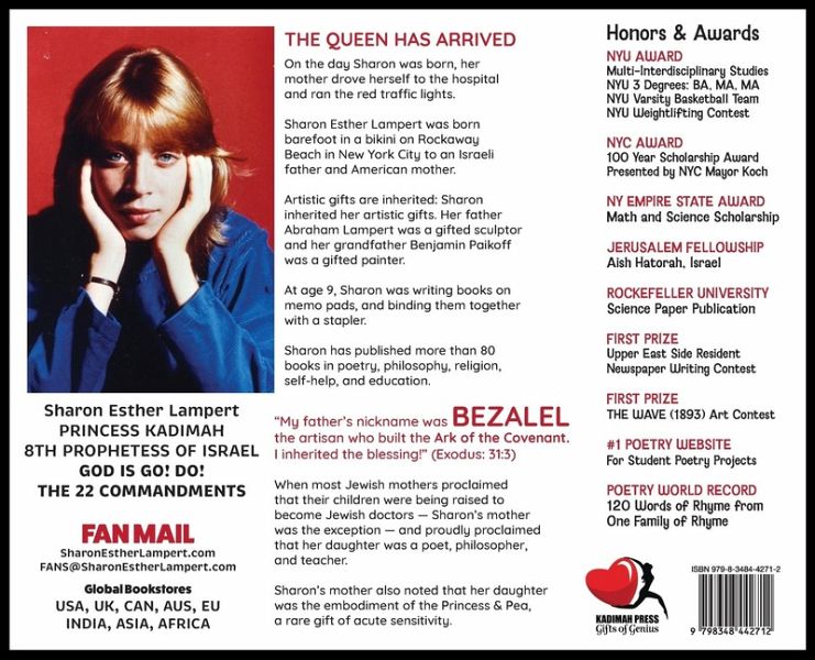 About the AuthorSEE THE WORLD THROUGH THE EYES OF A CREATIVE GENIUS: Sharon Esther Lampert has the #1 Poetry Website for Student Projects and Teacher Lesson Plans. NYC Mayor Edward Koch presented Sharon with the "100 Year Scholarship Award." NYU honored Sharon with a "Multi-Interdisciplinary Award." A secondary honor, Sharon Esther Lampert represented her class at her NYU Gallatin graduation. Sharon earned 3 NYU degrees. Sharon won an "Empire State Math and Science Scholarship Award." Sharon co-authored a scientific paper at Rockefeller University. Sharon won an "Aish Hatorah Jerusalem Fellowship Award." Sharonwon First Prize at the Upper East Side newspaper writing contest, NYC. Sharon won First Prize at the WAVE newspaper art contest. Her poetry has been published in thousands of online national and international poetry journals. On a global scale, Sharon Esther Lampert's poetry is used by students for their school projects. Teachers use Sharon Esther Lampert's poetry for their lesson plans. Sharon Esther Lampert's magnificent literary contributions to humanity encompass poetry, philosophy, prophecy, and education. Sharon Esther Lampert is also world famous for her ability to conceptualize philosophical ideas using one letter of the alphabet: THE AWESOME ART OF ALLITERATION USING ONE LETTER OF THE ALPHABET. In education, Sharon Esther Lampert pioneered the SMARTGRADES success strategy study skills. Her book, "The Silent Crisis Destroying America's Brightest Minds" was chosen as BOOK OF THE MONTH" by the Alma Public Library in Wisconsin If you are a seeker of truth and wisdom, Sharon Esther Lampert's books are packed to the brim with light. Expand your consciousness to a new dimension of spiritual transcendence.SEE THE WORLD THROUGH THE EYES OF A CREATIVE GENIUSSHARON ESTHER LAMPERTPopular Titles: Prodigy- Unleash the Creator, the God Within: 10 Esoteric Laws of Genius and CreativityProphet- Who Knew God Was Such a Chatterbox- 22 Commandments: A Universal Moral Compass for All People, for All Religions, and for All TimePhilosopherGod of What? 11 Esoteric Laws of InextricabilityPoet- I STOLE ALL THE WORDS FROM THE DICTIONARY- POETRY JEWELS: Diamonds, Rubies, Emeralds, Sapphires, and Pearls- VESSEL: Very. Extra. Special. Sharon. Esther. Lampert.- Immortality Is MinePioneer-. WIN AT THIN- SILLY LITTLE BOYS: 40 Rules of Manhood for Men of All Ages- SEX ON A PLATE: FOOD AS FOREPLAY: The Cookbook of Everlasting Love- LYMTY: Love You More Than Yesterday - 14 Relationship Strategies for Happily Ever After- YOUR WISH IS MY COMMANDMENT- Buried Alive in a Florida Condo: How Not to Wake-Up, Watch TV and Wait to DiePaladin of Education- SMARTGRADES BRAIN POWER REVOLUTION- THE SILENT CRISIS DESTROYING AMERICA'S BRIGHTEST MINDS- EVERY DAY AN EASY A- TOTAL RECALL: ACE EVERY TEST EVERY TIME- YOUR STUDY ROOM IS UNDER NEW MANAGEMENT-. Writers Run The World: 10 Secrets for Spinning Good Ideas into Great Ideas- SCHMALTZY, In America, Even A Cat Can Have A Dream (Ages 8-12)The Awesome Art of Alliteration Using One Letter of the Alphabet- CUPID: The Love Languages in Letter C- The Secret Sauce of Book Sales - Letter P- Temporary Insanity- Letter S- DESTINY - Letter D- POWER - Letter P- THERAPY - Letter T