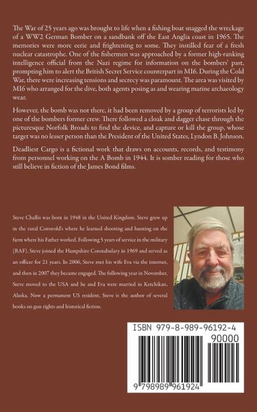 The War of 25 years ago was brought to life when a fishing boat snagged the wreckage of a WW2 German Bomber on a sandbank off the East Anglia coast in 1965. The memories were more eerie and frightening to some. They instilled fear of a fresh nuclear catastrophe. One of the fishermen was approached by a former high-ranking intelligence official from the Nazi regime for information on the bombers' past, prompting him to alert the British Secret Service counterpart in MI6. During the Cold War, there were increasing tensions and secrecy was paramount. The area was visited by MI6 who arranged for the dive, both agents posing as and wearing marine archaeology wear. However, the bomb was not there, it had been removed by a group of terrorists led by one of the bombers former crew. There followed a cloak and dagger chase through the picturesque Norfolk Broads to find the device, and capture or kill the group, whose target was no lesser person than the President of the United States, Lyndon B. Johnson. Deadliest Cargo is a fictional work that draws on accounts, records, and testimony from personnel working on the A Bomb in 1944. It is somber reading for those who still believe in fiction of the James Bond films.