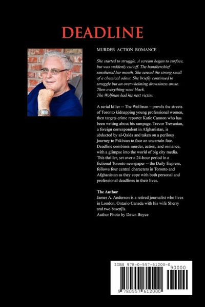 A serial killer--the Wolfman -- prowls the streets of Toronto kidnapping young professional women, then targets crime reporter Katie Cannon. Trevor Trevanian, a foreign correspondent in Afghanistan, is abducted by al-Qaida and taken on a perilous journey to Pakistan to face an uncertain fate. DEADLINE combines murder, action and romance, with a glimpse into the world of big city media. This thriller, set over a 24-hour period in a fictional Toronto newspaper, the Daily Express, follows four central characters in Toronto and Afghanistan as they cope with both personal and professional deadlines in their lives.